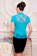 Рубашка молодежная,полуприлегающего силуэта.Рукав короткий.Воротник стойка.Полочка на застежку-планка на пуговицах,с кокеткой из гипюра,с рельефными швами.Внизу пришита надпись цвета золота.Спинка с фигурной кокеткой и баской из гипюра,и отлетной баской в виде рюши из основной ткани украшенная бантиком.Длина изделия 55 см.Рост модели 170 см..