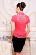Рубашка молодежная,полуприлегающего силуэта.Рукав короткий.Воротник стойка.Полочка на застежку-планка на пуговицах,с кокеткой из гипюра,с рельефными швами.Внизу пришита надпись цвета золота.Спинка с фигурной кокеткой и баской из гипюра,и отлетной баской в виде рюши из основной ткани украшенная бантиком.Длина изделия 55 см.Рост модели 170 см..