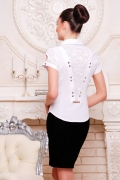 Рубашка женская,прилегающего силуэта.Рукав короткий из гипюра,с манжетой и вырезом в виде капли.Воротник рубашечного типа с острыми концами.Спинка со вставкой из гипюра оформленная отлетными планками украшенными пуговицами и металлической пластиной внизу.Полочка с застегивается на пуговицы.в области груди сборка.Низ слегка закругленный и задекорирован баской с гипюром.Длинна изделия 60 см.