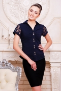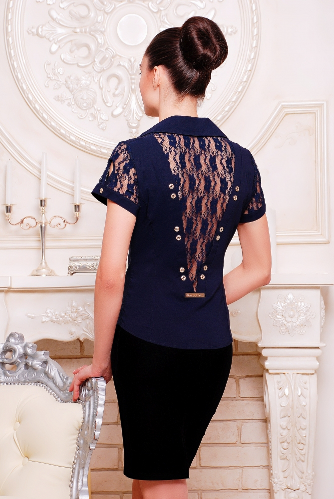 Рубашка женская,прилегающего силуэта.Рукав короткий из гипюра,с манжетой и вырезом в виде капли.Воротник рубашечного типа с острыми концами.Спинка со вставкой из гипюра оформленная отлетными планками украшенными пуговицами и металлической пластиной внизу.Полочка с застегивается на пуговицы.в области груди сборка.Низ слегка закругленный и задекорирован баской с гипюром.Длинна изделия 60 см.