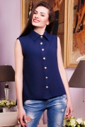 Рубашка-блуза женская,свободного силуэта,без рукавов.Воротник рубашечного типа с острыми концами.Полочка нагрудными вытачками и застежкой планкой на пуговицах.Спинка с двойной плечевой кокеткой,удлиненная по отношению к полочке.Длинна изделия 68 см.