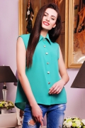 Рубашка-блуза женская,свободного силуэта,без рукавов.Воротник рубашечного типа с острыми концами.Полочка нагрудными вытачками и застежкой планкой на пуговицах.Спинка с двойной плечевой кокеткой,удлиненная по отношению к полочке.Длинна изделия 68 см.