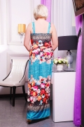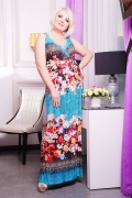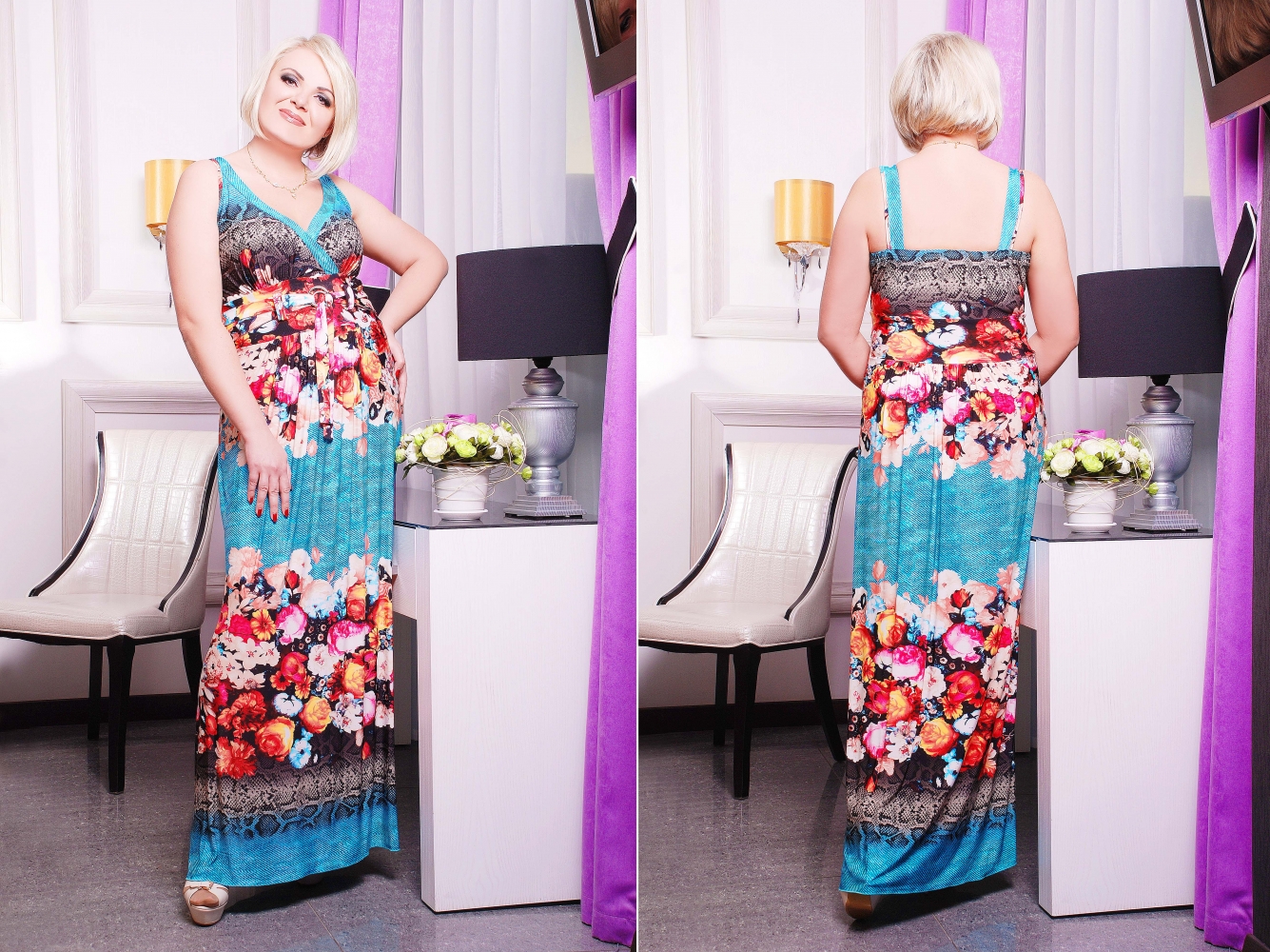 Сарафан женский, молодежный, батальный, полуприлегающего силуэта с длинной юбкой в пол. Лиф с запахом и V-образным вырезом, переходящим в узкие бретели на спине и мягкой сборкой под грудью. На широком завышенном поясе по полочке присутствует отлетной пояс завязывающийся на кольца. На юбке полочки и спинки мягкая сборка.