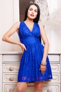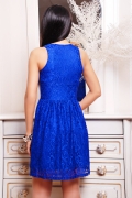 Платье молождежное полуприлегающего силуэта с отрезной юбкой по линии талии. Платье изготовлено из гипюра с широким отрезным поясом по линии талии. Платье без рукавов. Полочка с V-образным вырезом и небольшим запахом, под грудью заложена небольшая драпировка. На юбке по линии талии присутствует драпировка.