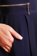Платье молодежное, полуприлегающего силуэта, отрезное по линии талии. Юбка полусолнце. Лиф оформлен рельефами. Лиф платья и юбку соединяет широкий пояс, на котором вшита декоративная молния из металла от рельефа полочки к рельефу спинки. Юбка полусолнце с бантовыми складами по переду и спинке. В боковом шве юбки заложен карман.