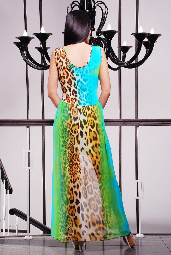 Сарафан молодежный,прилегающего силуэта.Глубокий вырез-мыс горловины полочки и спинки.Лиф отделен от юбки широким поясом.На поясе впереди шнур с декоративным украшением.Длинна сарафана из основной ткани около 85 см.В нижнюю часть пояса спинки и полочки вшита шифоновая юбка.