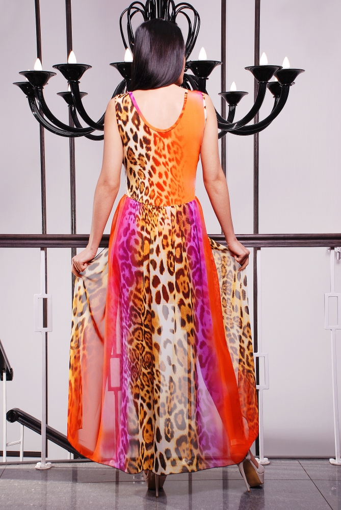 Сарафан молодежный,прилегающего силуэта.Глубокий вырез-мыс горловины полочки и спинки.Лиф отделен от юбки широким поясом.На поясе впереди шнур с декоративным украшением.Длинна сарафана из основной ткани около 85 см.В нижнюю часть пояса спинки и полочки вшита шифоновая юбка.