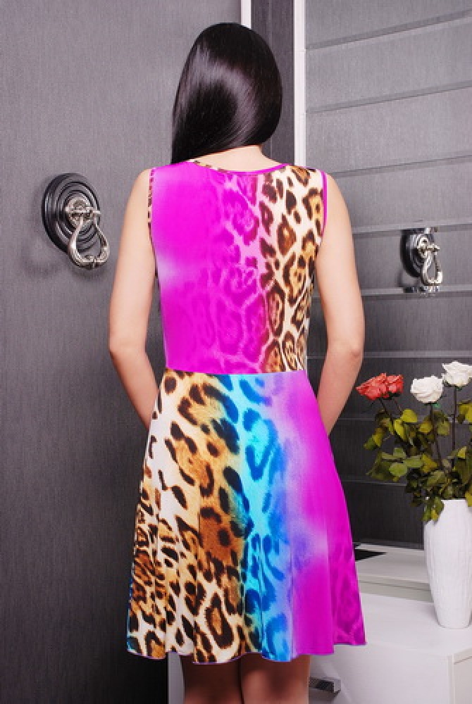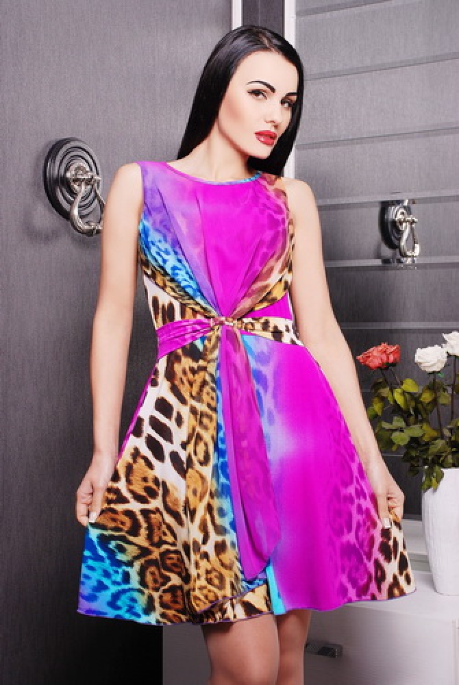 Сарафан женский, молодежный, полуоблегающего силуэта, без рукавов. Вырез горловины - лодочка. Лиф оформлен декоративной накладной драпировкой из отделочной ткани - шифона, украшен декоративным кольцом. Юбка отрезная полусолнце, длиной около 50 см.