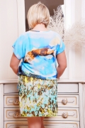 Молодежное платье-туника из шифоновой купонной ткани. По линии бедер проложена резинка, что позволяет делать напуск. По бокам платья находятся завязки с колокольчиками. Модель универсальная, как вариант сарафана и туники.