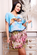 Молодежное платье-туника из шифоновой купонной ткани. По линии бедер проложена резинка, что позволяет делать напуск. По бокам платья находятся завязки с колокольчиками. Модель универсальная, как вариант сарафана и туники.