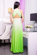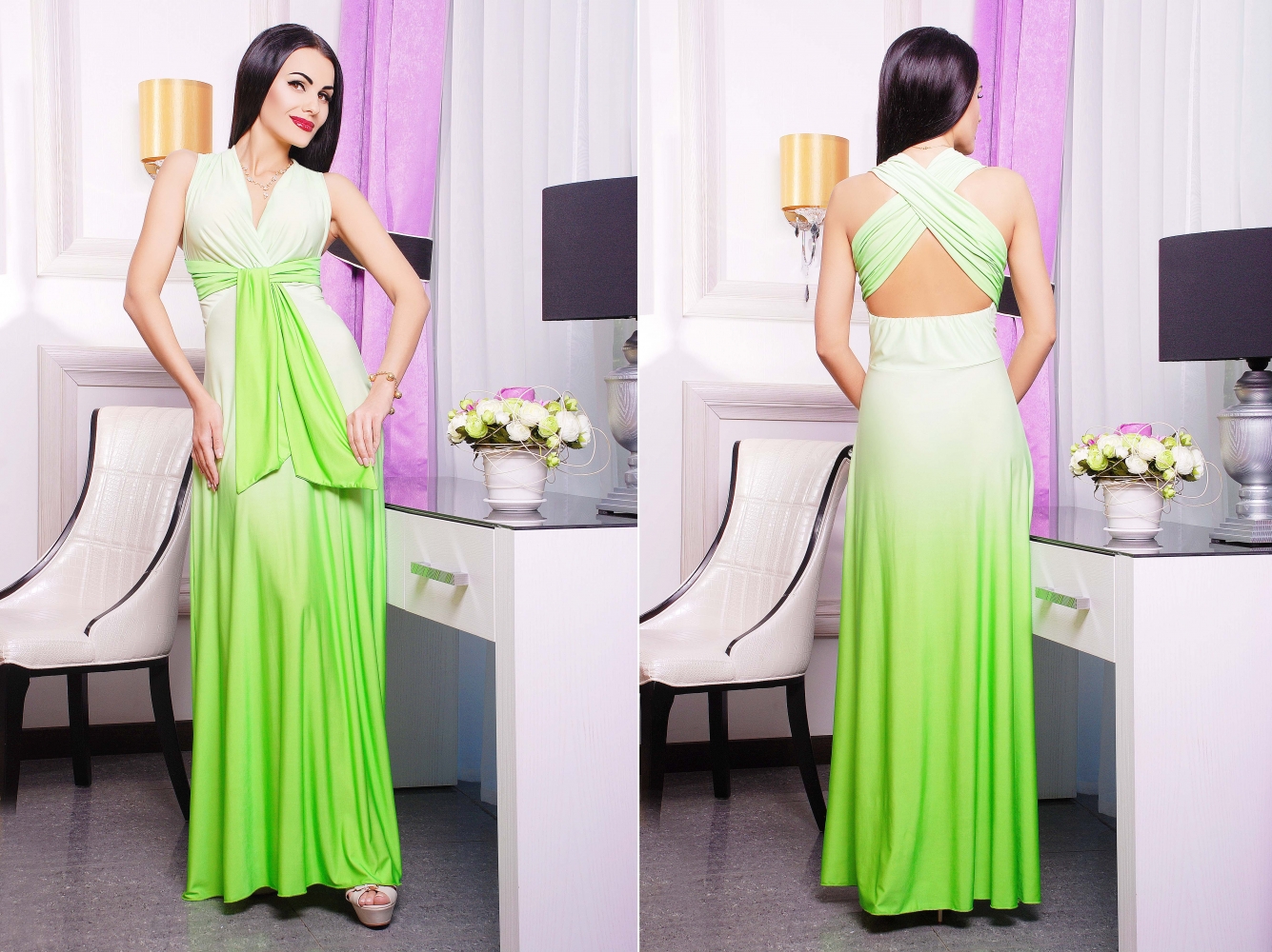 Платье трансформер, молодежное, длиной макси. Своей неповторимой конструкцией позволяет создать из одного платья множество образов. Летний трикотаж и цветовая гамма перехода, как будто специально созданы для того, чтобы подчеркнуть фигуру и сделать ее женственной и изящной. Длинные широкие завязывающиеся шарфы закрепленны на лифе.