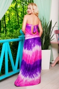 Сарафан молодежный свободного силуэта.Верх сарафана с напуском ,обработан сверху широкой бейкой-завязкой,формирующей широкий вырез на спине.Полочка отрезная по линии талии с поясом.Юбка прямая длинной max.Длинна около 150 см.