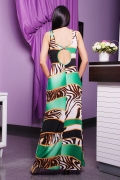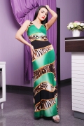 Сарафан молодежный,облегающего силуэта.Вырез лифа оформлен запахом.Под линией груди пояс отделяющий длинную юбку.Декоративный вырез на спинке украшен металлическим декором.Под ним на спинке находится пояс с драпировкой.Пояс так-же оформлен металлическим украшением.Плечи на завязках.