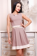 Платье молодежное. Отрезное по линии талии. Юбка со встречными складами. Спинка и полочка с рельефами. Платье без рукавов. Пояс и низ юбки из отделочной ткани контрастного цвета.