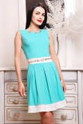 Платье молодежное. Отрезное по линии талии. Юбка со встречными складами. Спинка и полочка с рельефами. Платье без рукавов. Пояс и низ юбки из отделочной ткани контрастного цвета.