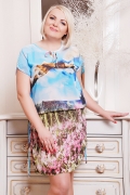 Молодежное платье-туника из шифоновой купонной ткани. По линии бедер проложена резинка, что позволяет делать напуск. По бокам платья находятся завязки с колокольчиками. Модель универсальная, как вариант сарафана и туники.